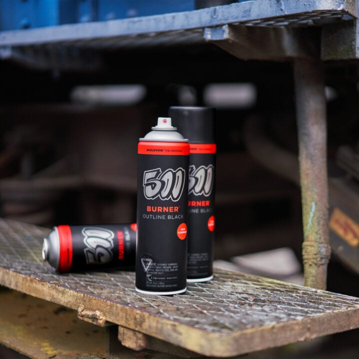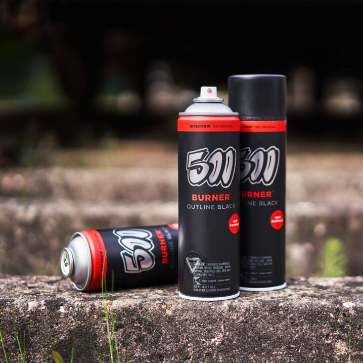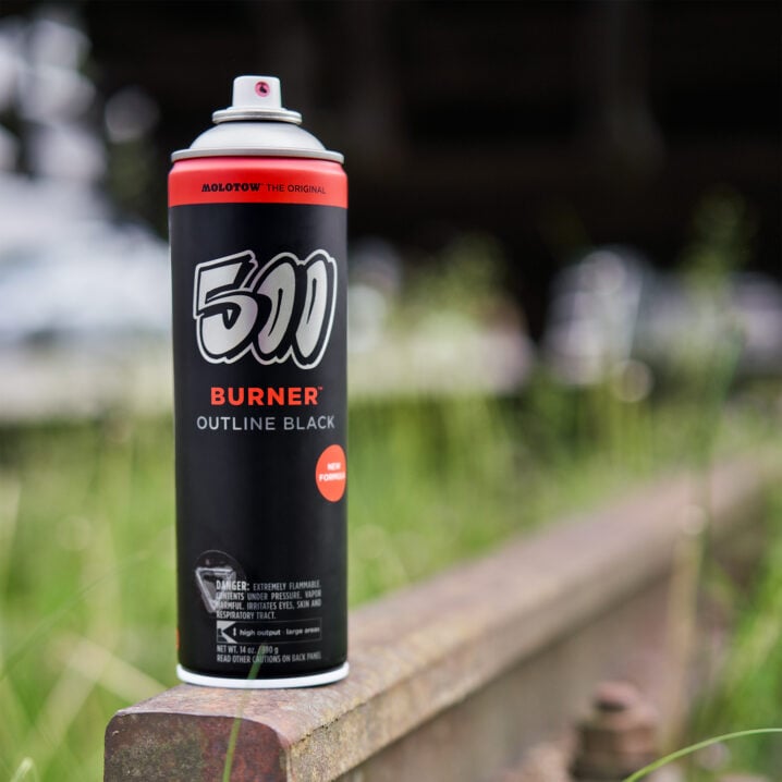 Molotow Burner Black is now available in a smaller, 500ml can, specifically designed for buttery-smooth outlines. For use on nearly all surfaces, this highly opaque matt paint dries quickly. A Flowmasterâ„¢ valve allows for constant paint output without exhaustion. Burner Black is the perfect partner for Burner Chrome and the whole Molotow Action range.