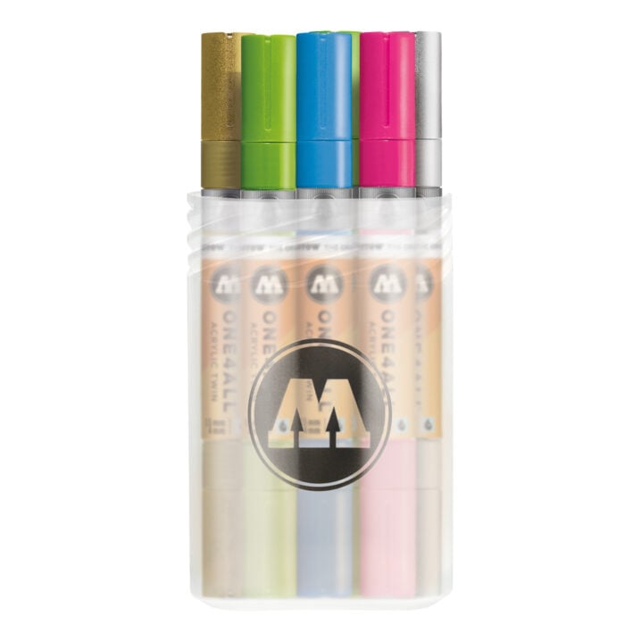 This 12 Pack of Molotow One4All acrylic Twin Tip Paint Markers features some of the classic colours from the range. The two varying sized tips measure 1.5.mm and 4mm. Compatible with Molotow's full colour spectrum of spray paint, the Molotow One4All Marker range is the perfect tool for creating vibrant mixed media artwork. The paint used in each marker can be refilled once used up, tips can be replaced and exchanged dependent on the fitting. The semi-gloss, permanent One4All paint used will allow you to write on almost any surface and put down a solid, highly opaque colour application with minimal effort.