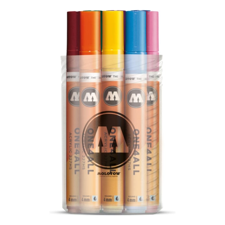 The Molotow 227 One4All Marker features a 4mm pump action tip. This 12 pack contains some of the best basic shades, and is compatible with Molotow's full colour range of spray paint. The Molotow One4All Marker range is the perfect tool for creating vibrant mixed media artwork. The paint used in each marker can be refilled once used up. The tips can be replaced and exchanged dependent on the fitting. The semi-gloss, permanent One4All paint used will allow you to write on almost any surface, and put down a solid, highly opaque colour application with minimal effort.