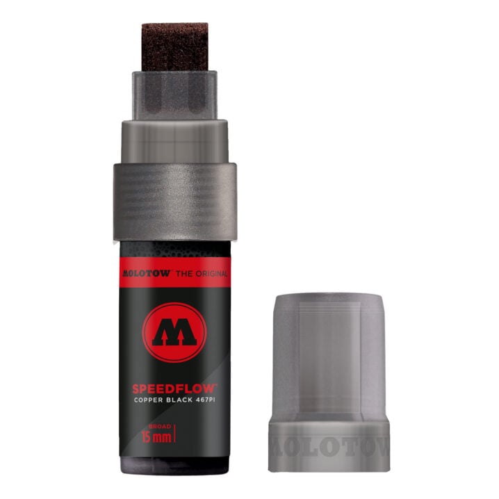 One of the brands smallest and most reliable markers, the pocket sized Molotow 467PI Speedflow contains Copper Black ink. An alcohol based, synthetic bitumen ink that makes your marks stay where you want them. The Pump action broad nib creates a line width of 15mm, meaning it's perfect for thick lettering or calligraphy.
