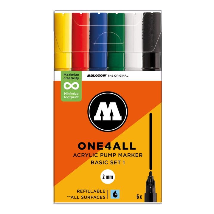 This 6 Pack of Molotow One4All Twin Tip Paint Markers features a selection of basic colours from the range. Compatible with Molotow's full colour spectrum of spray paint, the Molotow One4All Marker range is the perfect tool for creating vibrant mixed media artwork. The paint used in each marker can be replaced when empty. Tips will exchange for other styles or sizes.  The semi-gloss, permanent One4All paint used will allow you to write on almost any surface. Put down a solid, highly opaque colour application with minimal effort.