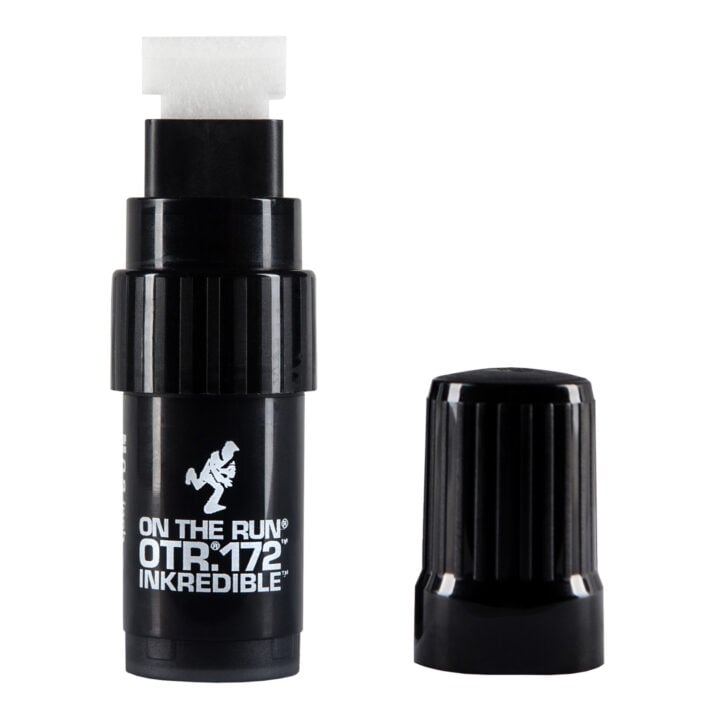 On The Run OTR.172 Inkredible, complete with 15mm broad pump action nib for wide lines. This is the smaller barrel version of the .072, truly pocket sized. Filled with a high quality alcohol based heavy duty industrial ink, these markers are available in either red or black. Ultra fade proof and highly UV resistant, these markers are extremely permanent. A multi purpose marker for broad lines and filling in larger areas.
